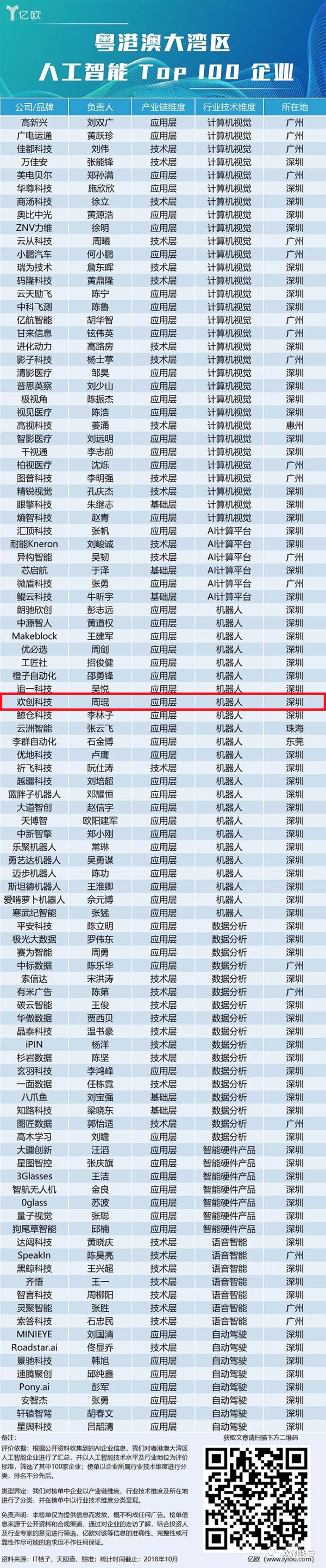 2018年10月19日,由亿欧公司主办的“引擎·引领” 2018大湾区国际科创峰会(Bay Areas Tech Innovation Summit, 简称BATi)再发一力,在活动现场重磅发布了“2018粤港澳大湾区人工智能百强企业”。