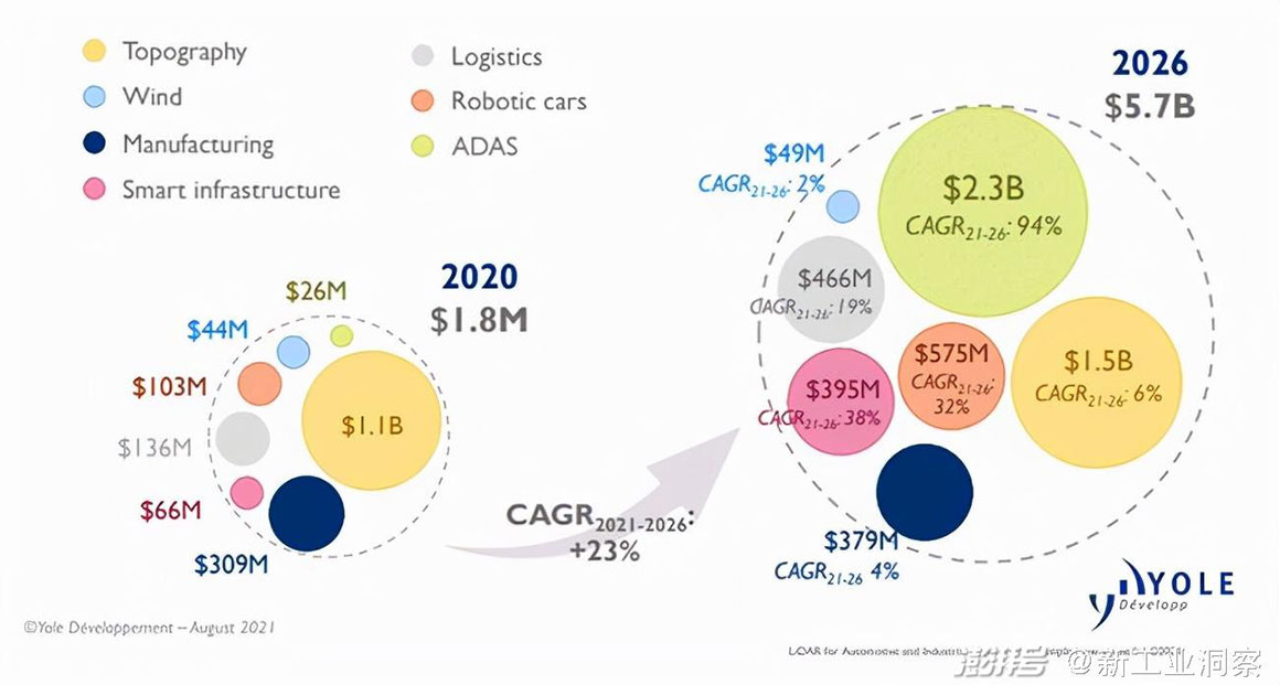 According to Yole's forecast, the lidar market will reach US$5.7 billion by 2026, and the compound annual growth rate will reach 21% from 2020 to 2026. In the segmented market, the fastest growth rate of smart cities will reach 35%; self-driving taxis The growth rate of cars and buses is 33%; intelligent logistics is 23%.